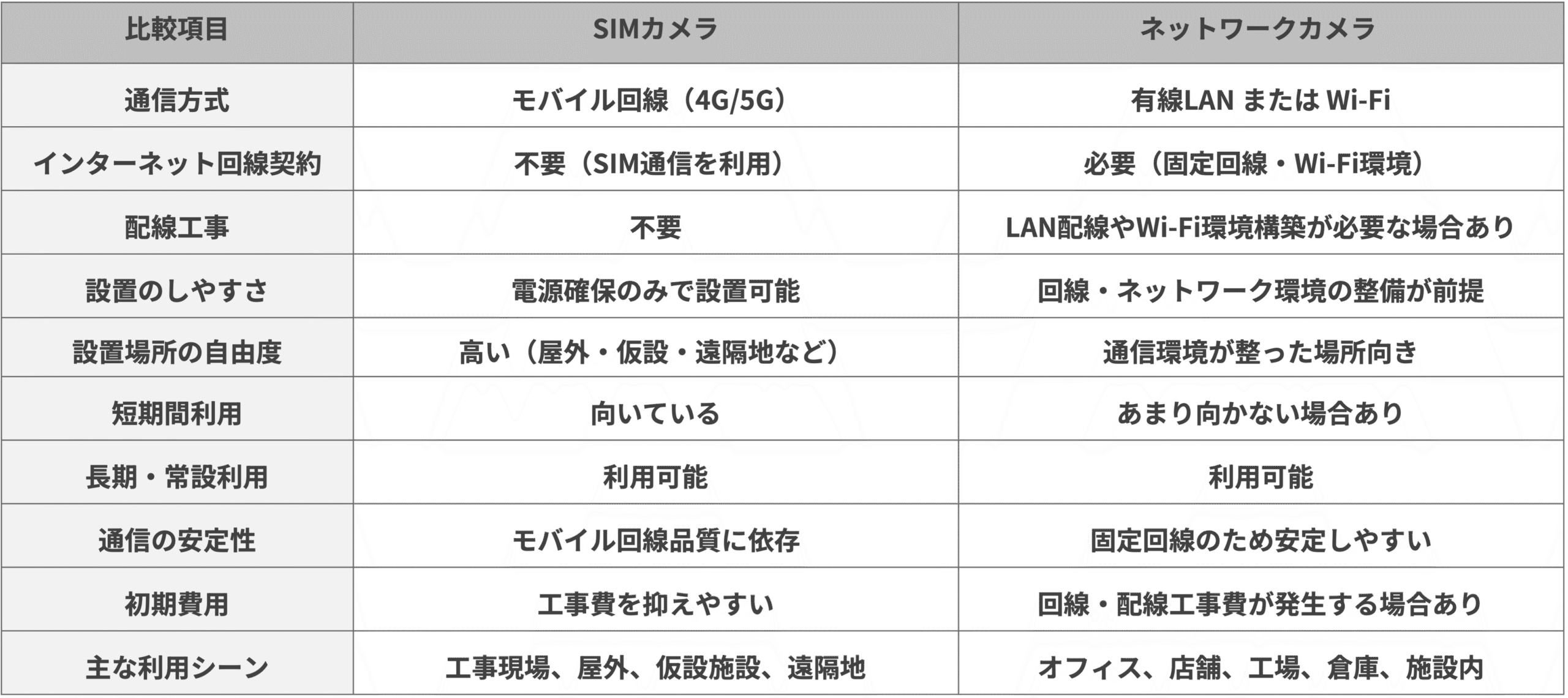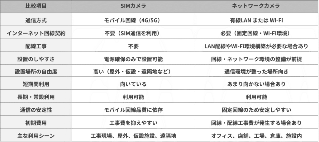 SIMカメラはSIM通信でインターネットに接続するため、インターネット回線契約は不要です。また、SIMカメラは電源供給のみで稼働するため、通信ケーブルの敷設工事も必要ありません。